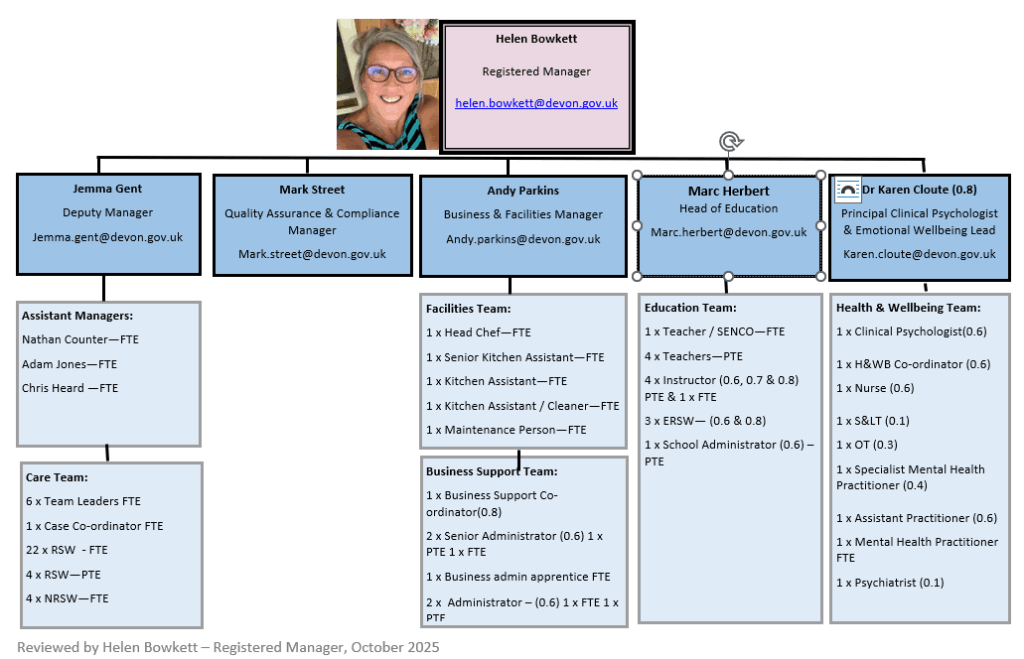 The school structure consists of a Head of Education, four Teachers (including one SENCO), three Instructors, Teaching Assistant (pastoral support) and three Residential Education Support Workers.